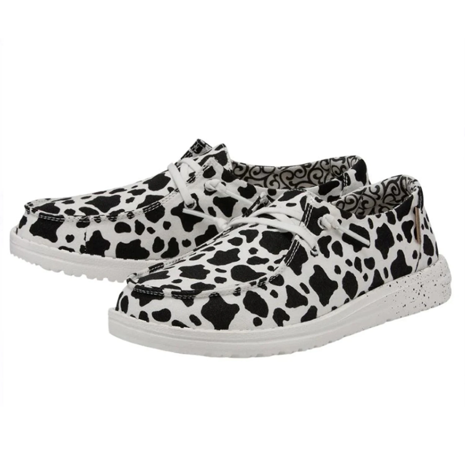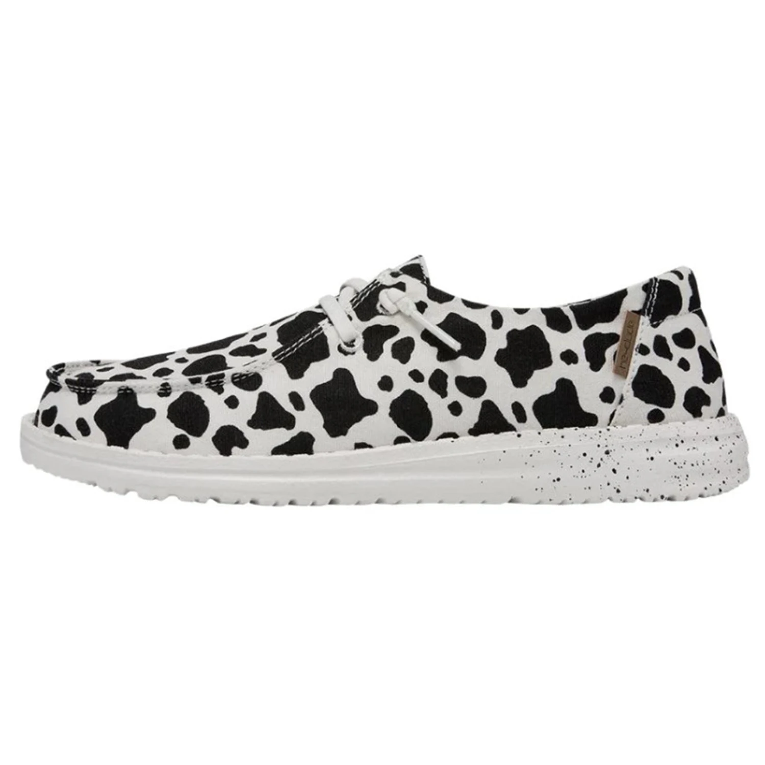 These new cowprint heydudes are sure to be a show stopper. These fun bold shoes are comfy and lightweight. They feature an easy on elastic lacing system and an ultralight outsole making it easy to explore.